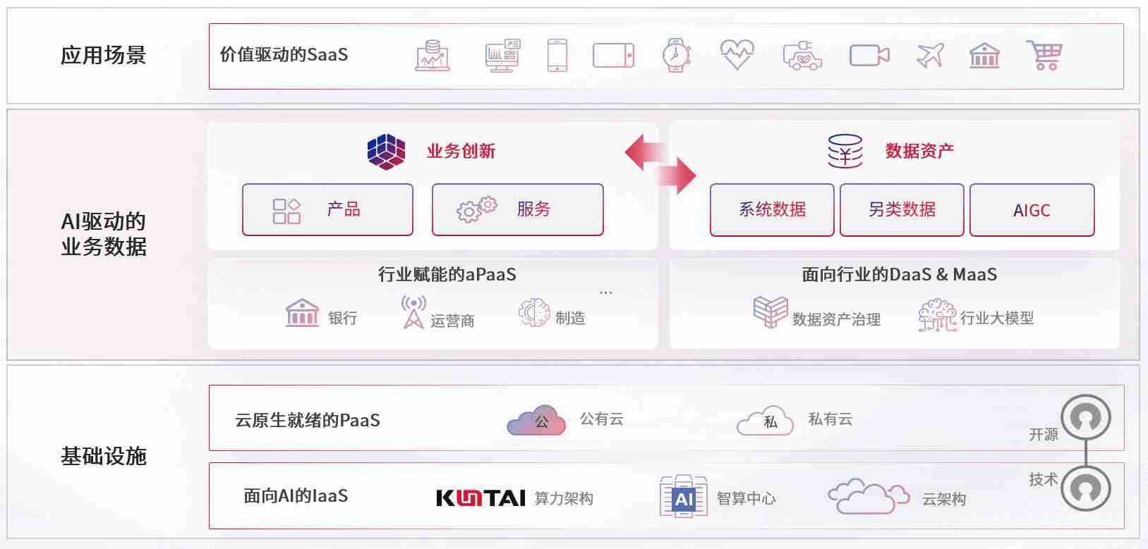 数字时代,,,围绕企业数字化转型的关键要素,,,AG尊龙凯时数码开创性的提出数云融合战略和技术体系框架,,,着力在云原生、、数字原生、、、AI原生和信创产业上架构产品和服务能力,,为处在不同数字化转型阶段的快消零售、、、、汽车、、金融、、、医疗、、、政企、、教育、、、、运营商等行业客户提供泛在的敏捷IT能力和融合的数据驱动能力,,,,构建跨界融合创新的数字业务场景和新业务模式,,助力企业级客户建立面向未来的核心能力和竞争优势,,,,全面推动社会的数字化、、、智能化转型升级。。。。