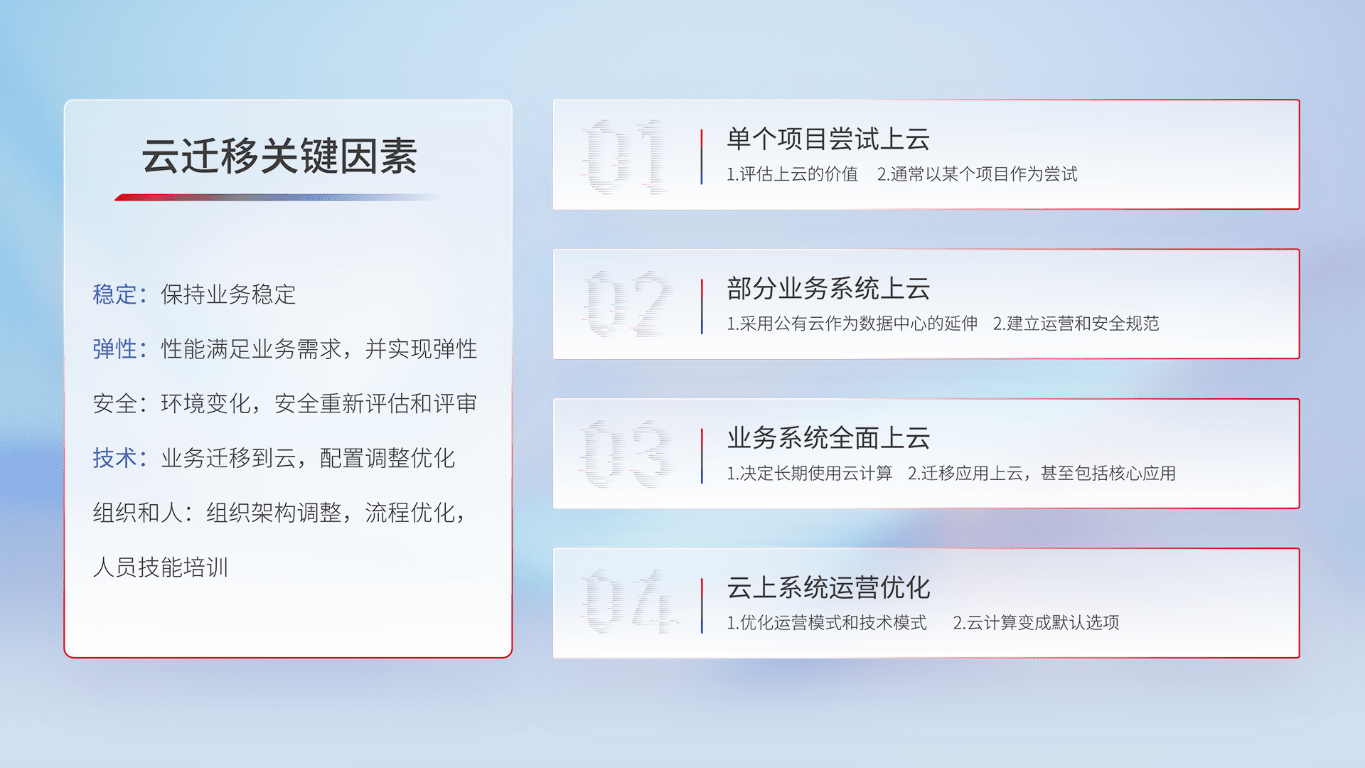 结合实际业务,,,从规划设计、、、、云平台选型、、云原生改造、、数据迁移、、、、集成交付,,,,迁移全过程为客户识别最佳上云路径,,做好风险识别管理,,,,设计网络架构、、身份权限、、安全审计合规、、操作审计、、、、日志审计、、、、监控告警策略、、多站点容灾设计等,,对云上基础设施进行整体规划,,,,提升IT治理水平,,以满足弹性、、、高可用、、高性能的需求。。
