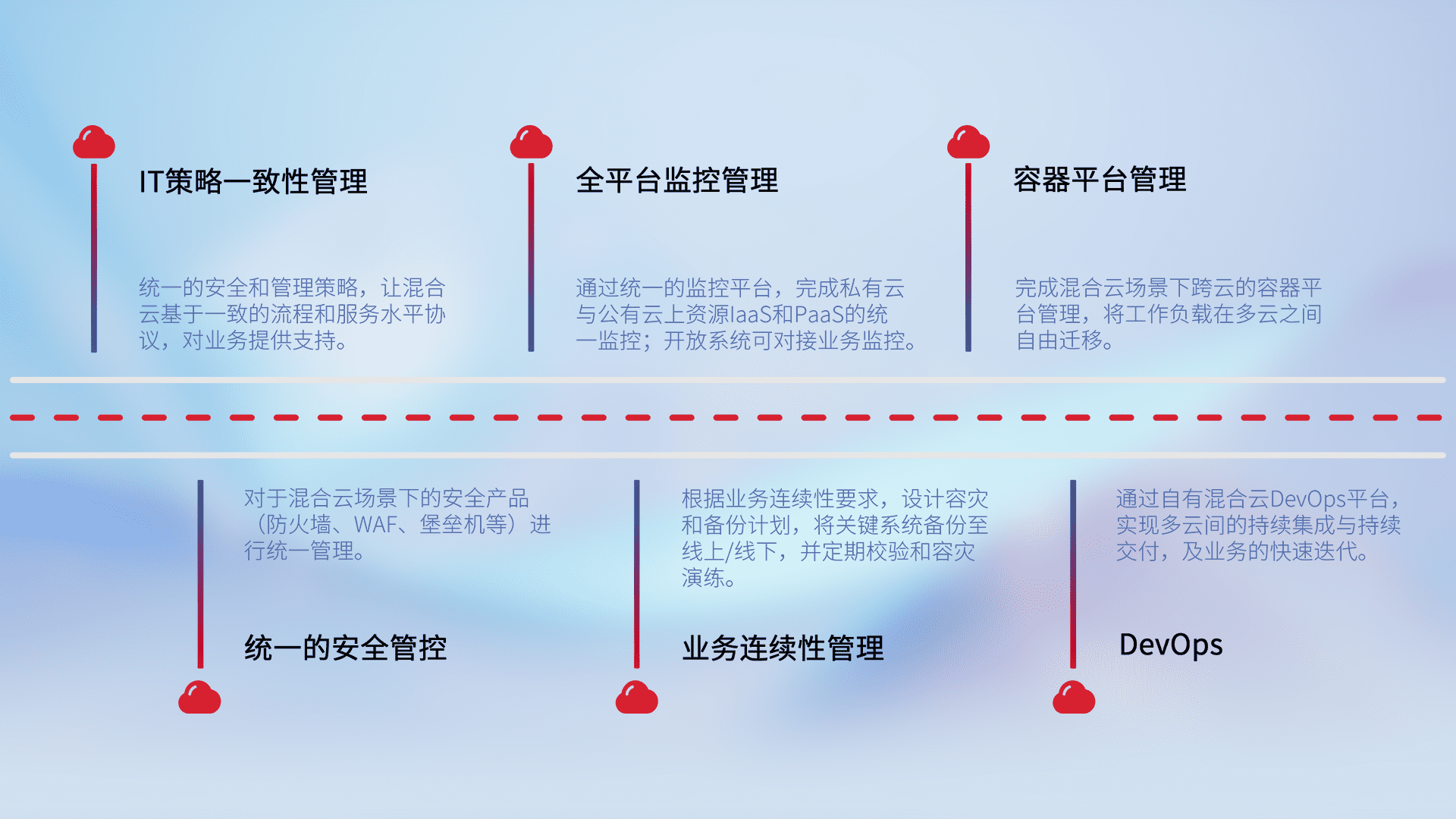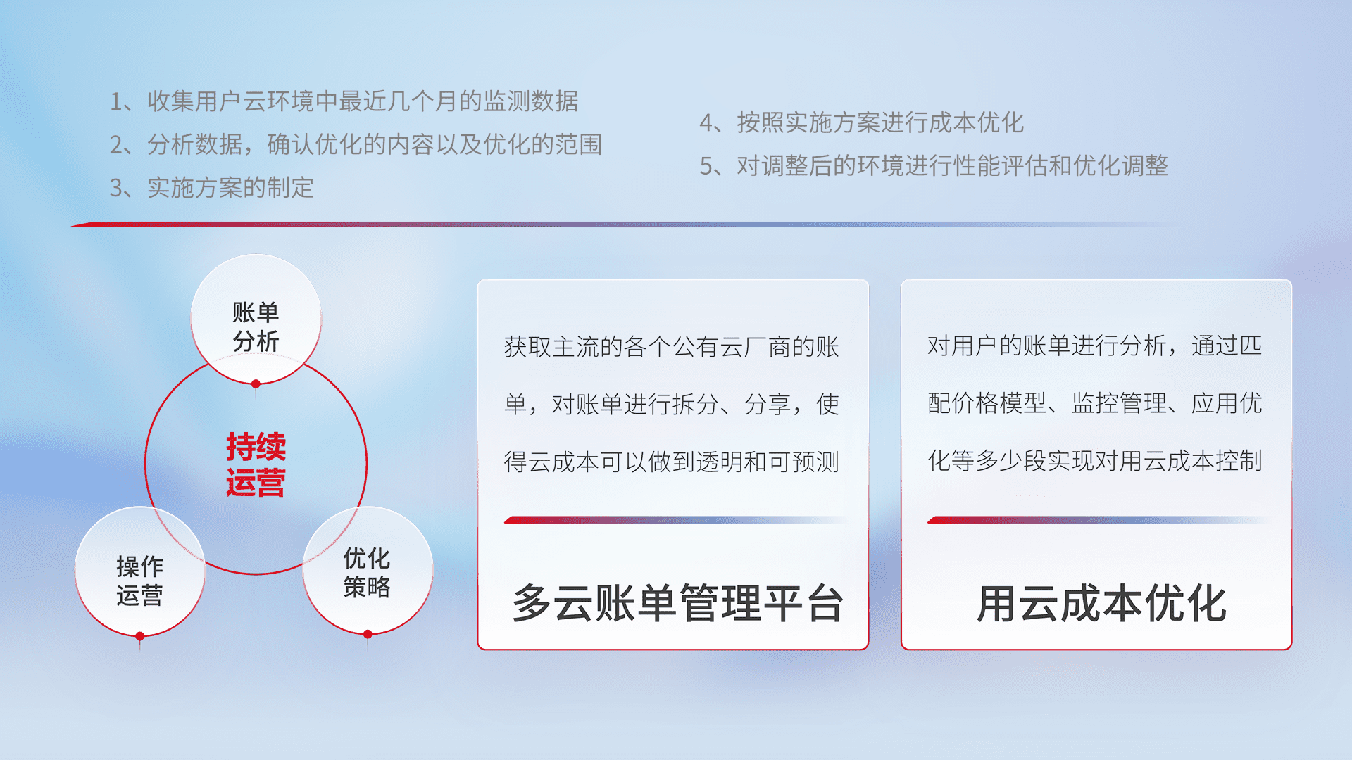 通过多云纳管,,以统一的资源数据模型把客户的云资源进行抽象和封装,,,进而实现对多云资源的统一操作,,保障云资源管理的可靠性、、、、稳定性与可用性。。量身定制化运维内容,,配置、、、开发运维、、补丁管理、、、、备份、、、、监控、、、认证和访问管理、、、、审计和日常巡检等,,保障在用云过程中的可靠度,,稳定度以及高可用率。。。。