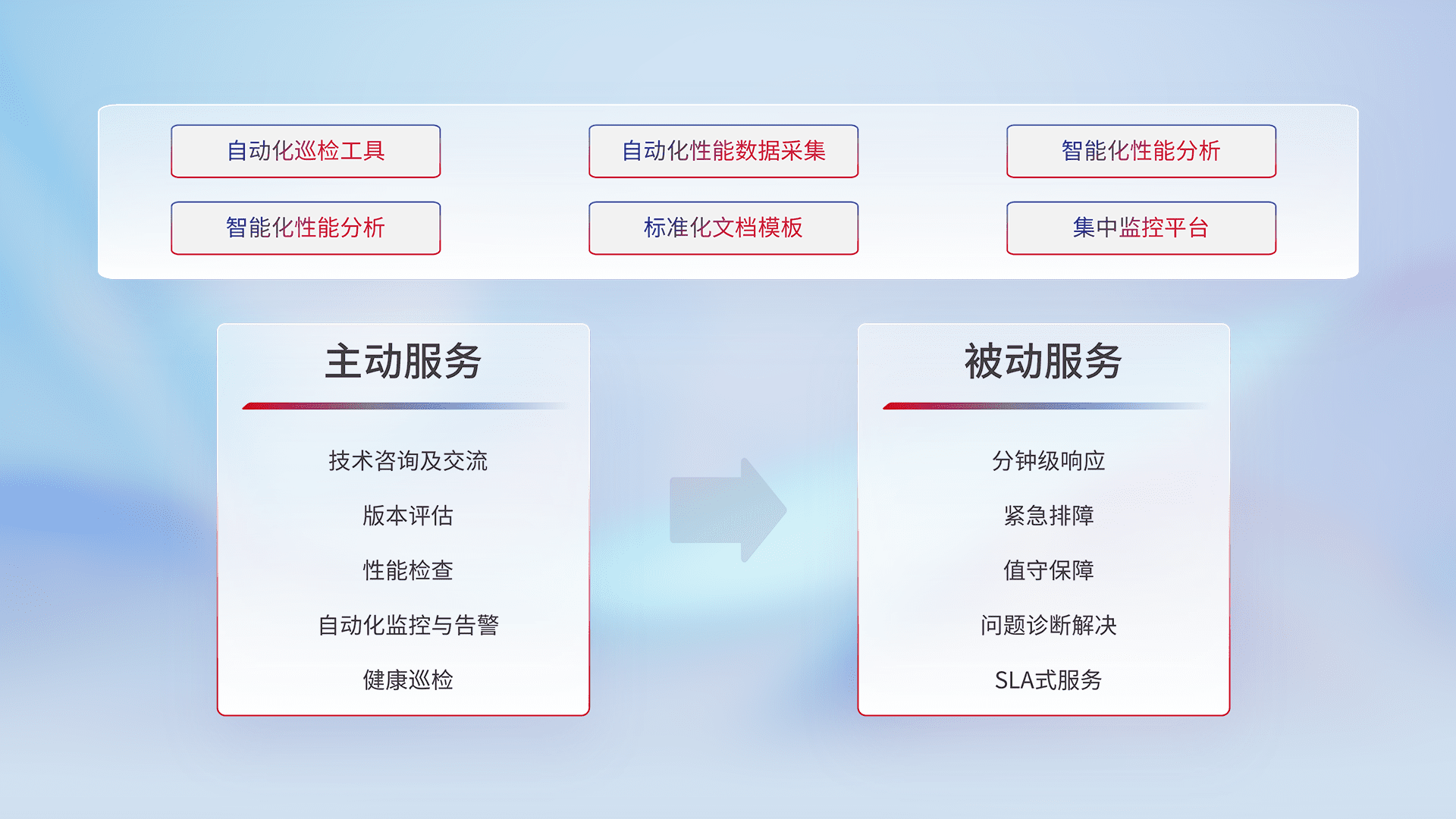 智能化工具和标准化文档,,,保障服务质量,,,提供主动服务(包含技术咨询、、、版本评估、、性能检查、、、、自动化监控与告警、、健康巡检)和被动服务包含(分钟级响应、、紧急排障、、值守保障、、、、问题诊断解决、、、SLA服务)。。