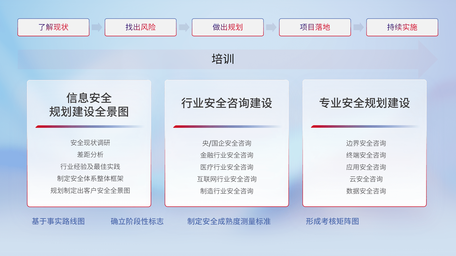 梳理客户信息安全现状调研、、差距分析结果,,,,结合行业先进经验及最佳实践,,制订客户的信息安全管控体系总结架构,,,,最终形成一个完整的客户信息安全规划与建设的全景图。。