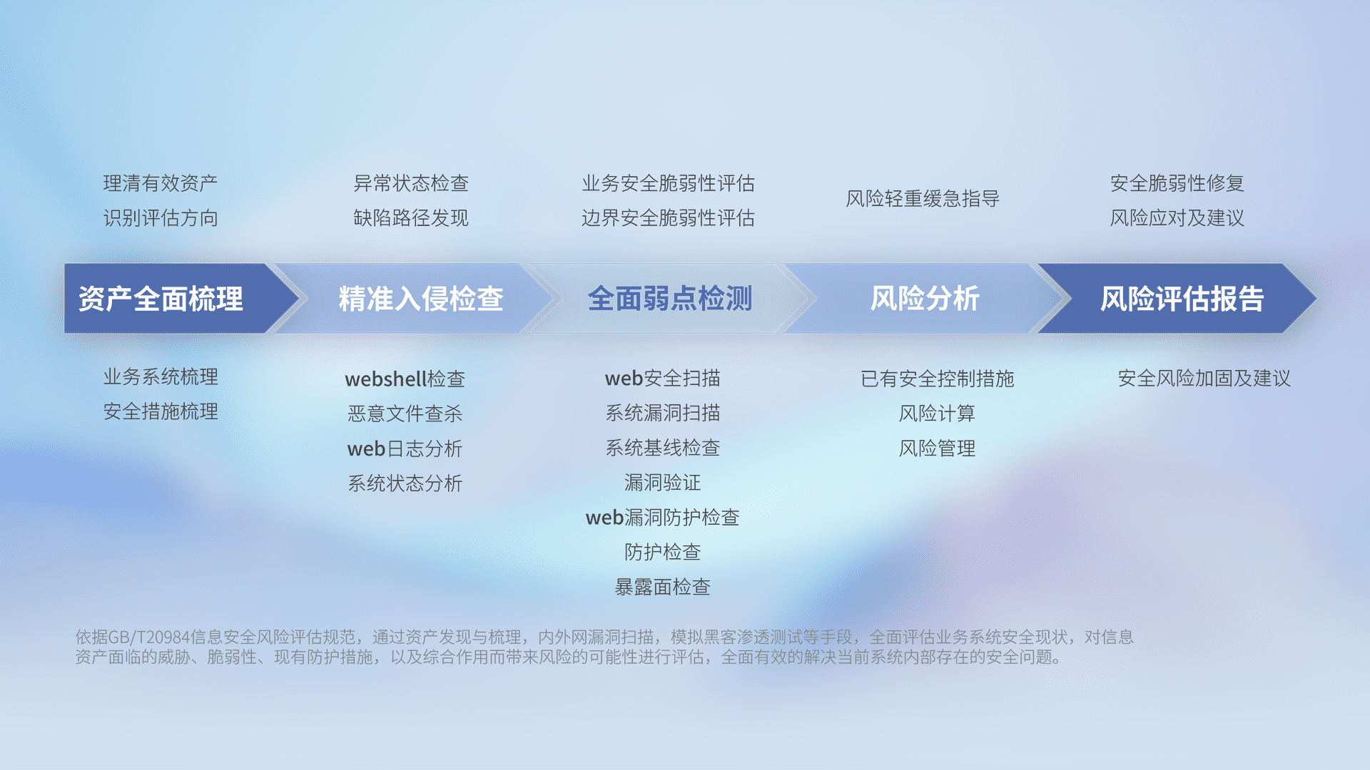 针对客户行业特性,,,以专业的安全服务+多厂商联合解决方案提供专属的一站式安全管理服务,,帮助客户全面感知网络空间威胁,,基于识别、、、检测、、、分析、、防护、、监测、、响应的服务理论模型,,从方案咨询、、、集成交付、、、、评估验证、、、、优化加固、、、、运维运营,,致力于为客户提供完整的闭环管理式安全服务。。。以实战经验为客户打造高抵御风险的安全体系,,,帮助客户发现威胁、、、、对抗威胁、、处置威胁,,,,不断积累安全对抗能力,,,,持续保障数字化安全。。。。